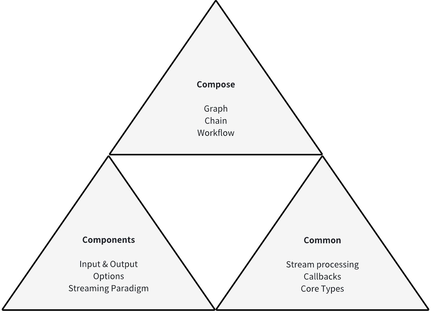 Additionally, Eino follows a modular design, with the core library and various component implementations as separate go modules, each go module achieving minimal dependencies. Meanwhile, the API design follows principles of “simplicity”, “intuitiveness”, and “isomorphism”, supplemented by comprehensive documentation that progresses from basic to advanced, making the learning curve as smooth as possible. Most importantly, Eino adopts a clear layered design, with each layer having clear responsibilities and cohesive functionality, improving maintainability while better ensuring stability.