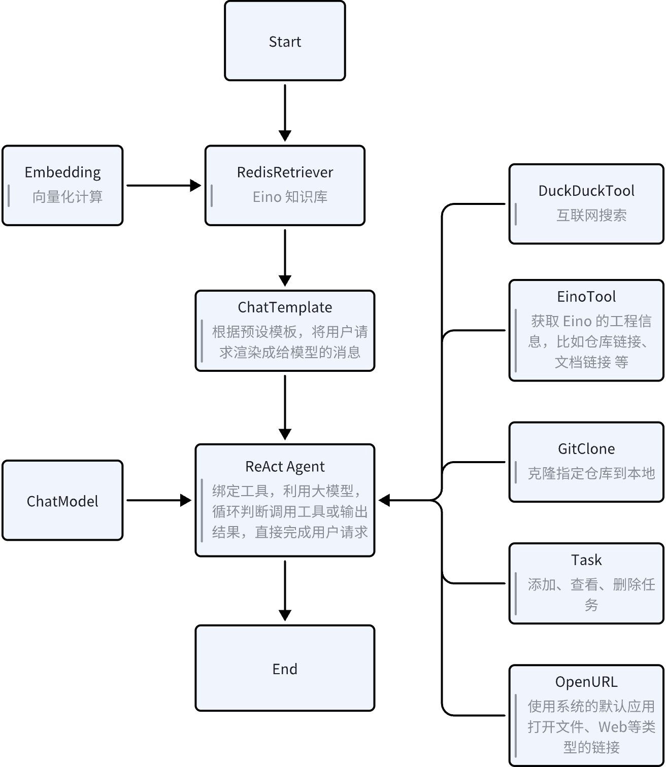 构建一个基于从 Redis VectorStore 中召回的 Eino 知识回答用户问题,帮用户执行某些操作的 ReAct Agent,即典型的 RAG ReAct Agent。可根据对话上下文,自动帮用户记录任务、Clone 仓库,打开链接 等。